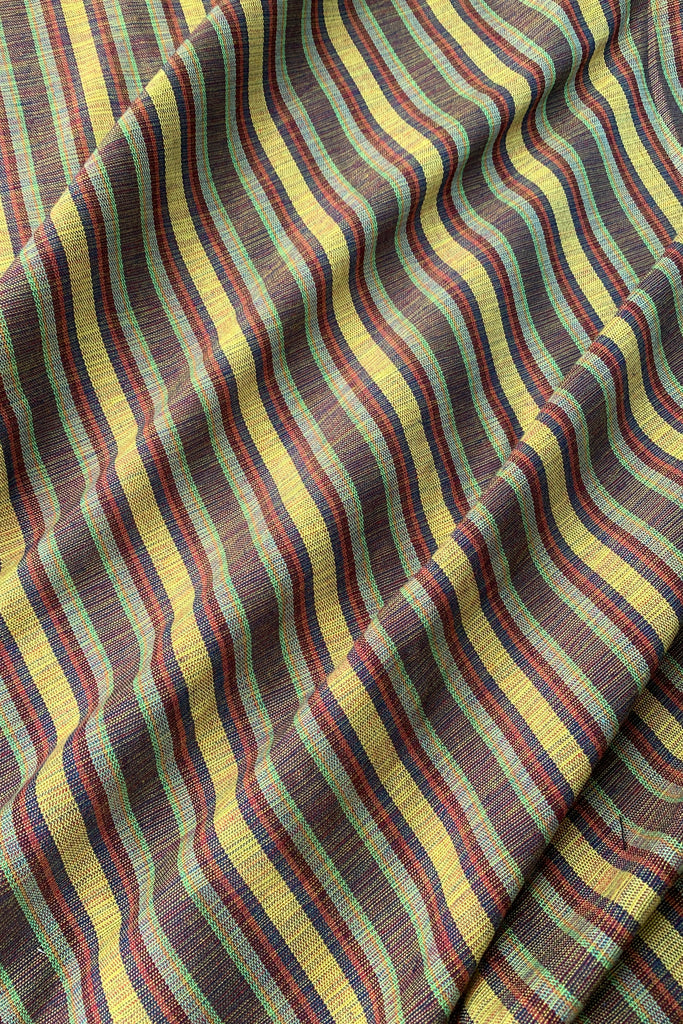 The Kantarines weaves are upcycled commercial polyester scraps made by our partner weavers in Abra, Ilocos Norte. The Kantarines has a linen like feel that features stripes of various widths and playful colors combinations giving the fabric its character. The Kantarines weaves are traditionally used as tapis or wrap around skirts by the women in Abra.
